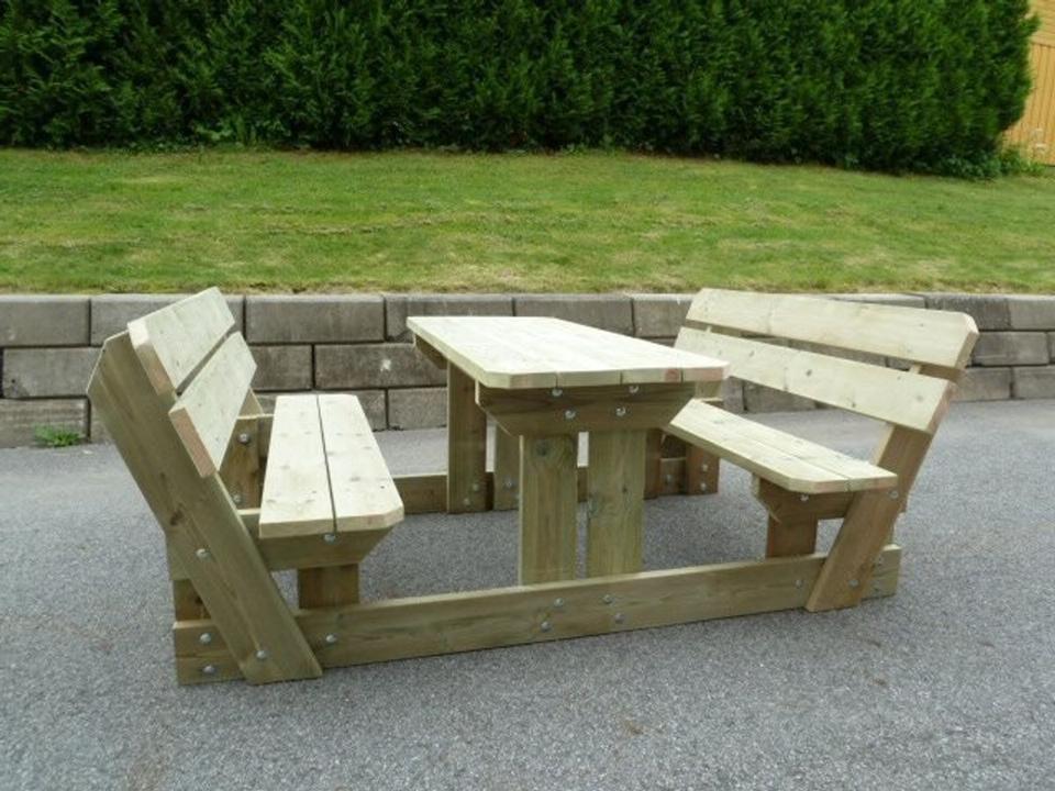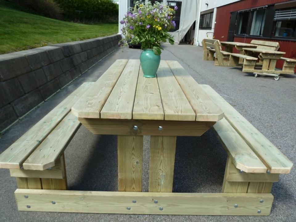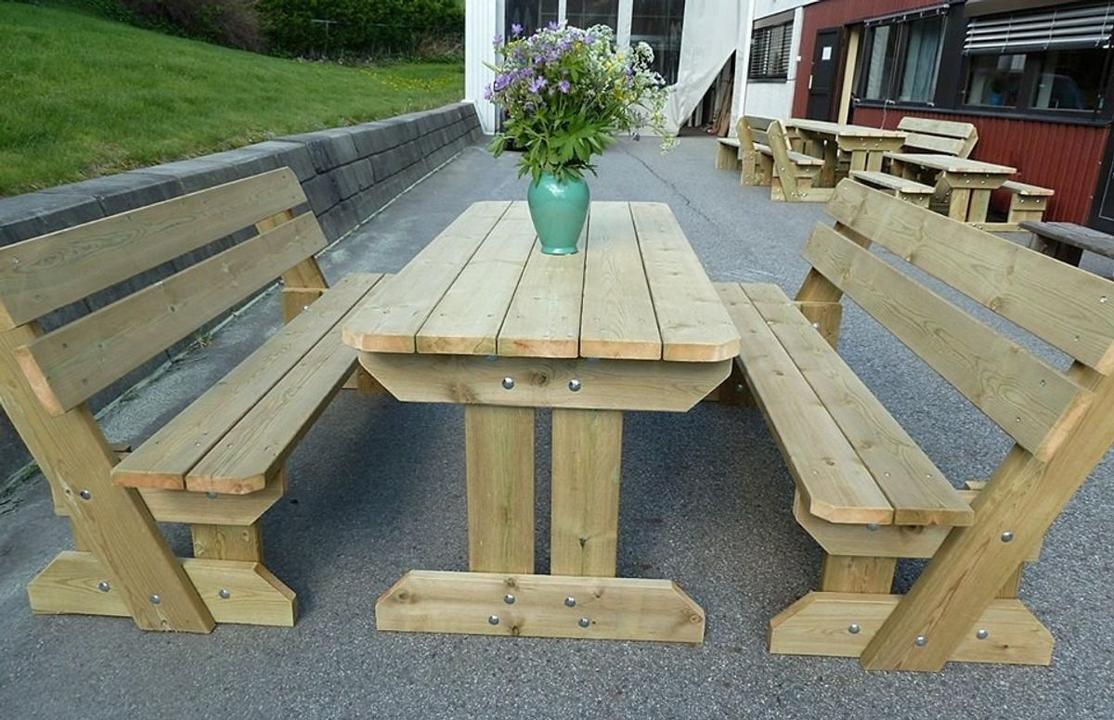 Alle møblene er laget i trykkimpregnerte materialer i størrelsen 36 mm x 148 mm, noe som sikrer høy kvalitet og lang holdbarhet. Vi tilbyr standardmål, men kan også spesialtilpasse etter ønske og behov.